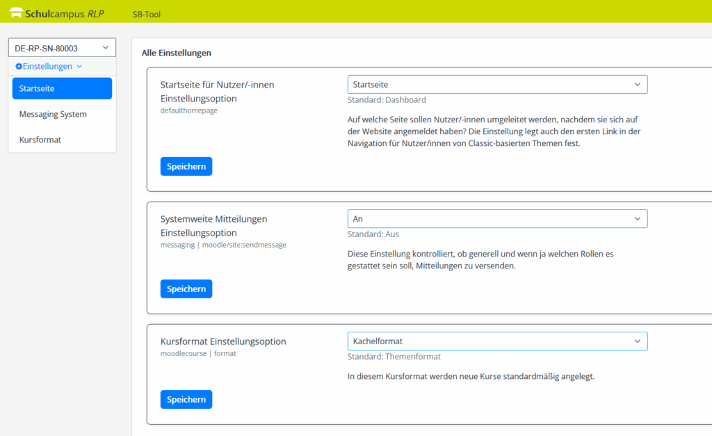 - Startseite – Voreinstellung des Defaults für die Instanz (Startseite, Dashboard, meine Kurse).