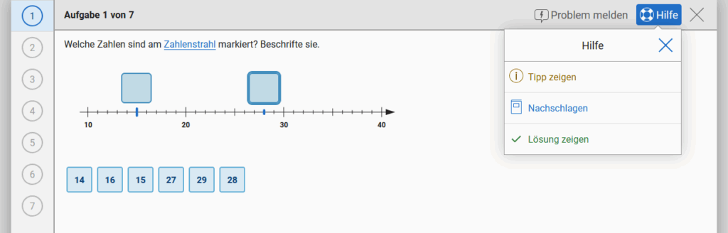 In den Übungen findest du unter „Hilfe“ nicht nur Tipps, sondern kannst auch auf Hilfeseiten nachschlagen.