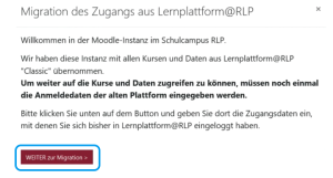 Lesen Sie den Text bitte aufmerksam durch und klicken Sie auf Weiter zur Migration. - Für den Abschluss der sogenannten Migration melden Sie sich mit den alten Zugangsdaten zu Lernplattform@RLP Classic an.